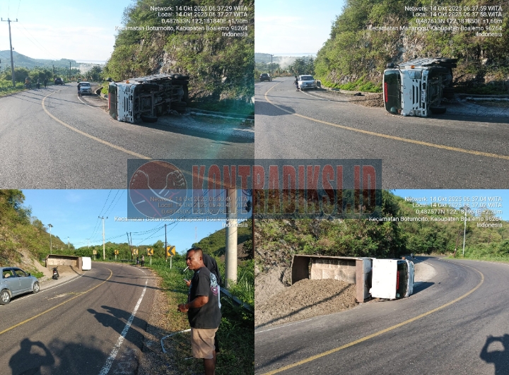 Boalemo, 14 Oktober 2025 — Sebuah mobil dump truk Isuzu DM 8493 BF mengalami kecelakaan tunggal di tanjakan Mananggu, Kabupaten Boalemo, pada Selasa dini hari sekitar pukul 05.00 WITA. Beruntung, peristiwa tersebut tidak menimbulkan korban jiwa. Sopir truk, Aten Kahar, berhasil menyelamatkan diri dari situasi berbahaya itu.